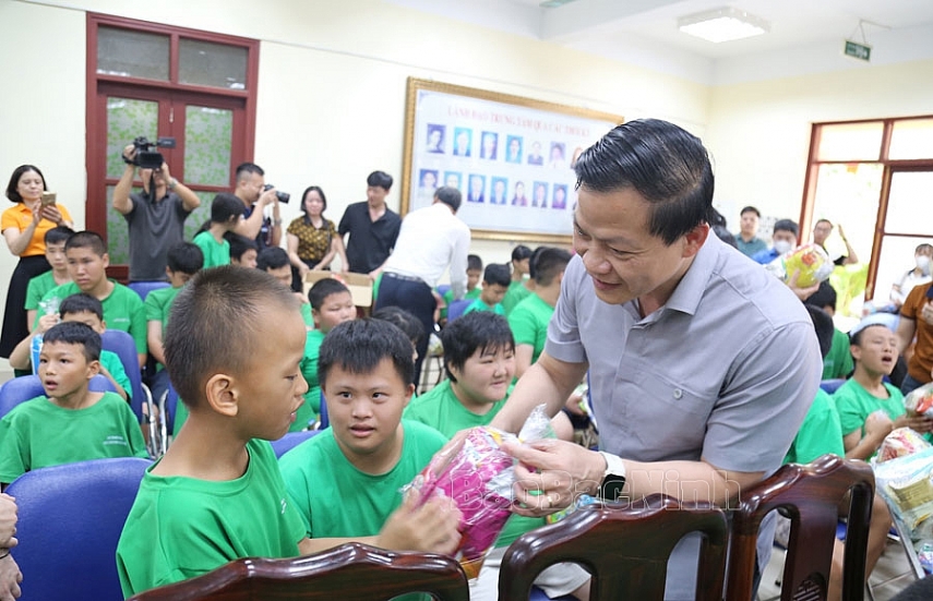 | Chủ tịch UBND tỉnh Vương Quốc Tuấn tặng quà các em học sinh Trung tâm Giáo dục chuyên biệt và Bảo trợ xã hội tỉnh nhân dịp 1/6. |