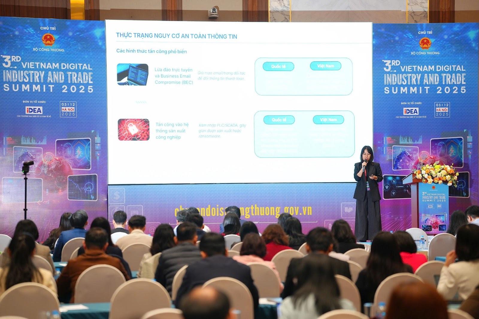 Tiếp nối chủ đề chuyển đổi kép, vấn đề an toàn thông tin – mắt xích quan trọng trong quá trình số hóa – được bà Nguyễn Như Quỳnh, Đồng sáng lập và Giám đốc Vận hành Tổ chức Chống Lừa Đảo, phân tích qua tham luận “Chuyển đổi số an toàn: Bảo vệ doanh nghiệp Công Thương trước tấn công mạng và gian lận AI 2025”. Bà Quỳnh nêu rõ khi ngành Công Thương đẩy mạnh số hóa ở quy mô toàn diện, nguy cơ tấn công mạng cũng gia tăng tương ứng, đặc biệt với các hình thức tội phạm công nghệ cao như lừa đảo trực tuyến, giả mạo email/thông tin đối tác để thay đổi điều khoản thanh toán (BEC), tấn công vào hệ thống vận hành công nghiệp và gian lận thương mại xuyên biên giới. Trong bối cảnh công nghệ AI phát triển nhanh, các hình thức tấn công mới như phishing tự động, deepfake thời gian thực – từ giả giọng đến giả hình ảnh và video của lãnh đạo – khiến rủi ro trở nên nghiêm trọng hơn và trực tiếp nhắm vào con người, mắt xích dễ tổn thương nhất trong hệ thống an ninh mạng.