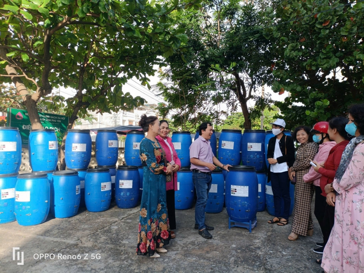 | TS Võ Anh Khuê hướng dẫn người dân huyện Phú Hòa tiến hành sử dụng thiết bị ủ rác thải hữu cơ dễ phân hủy sinh học ở cụm dân cư |