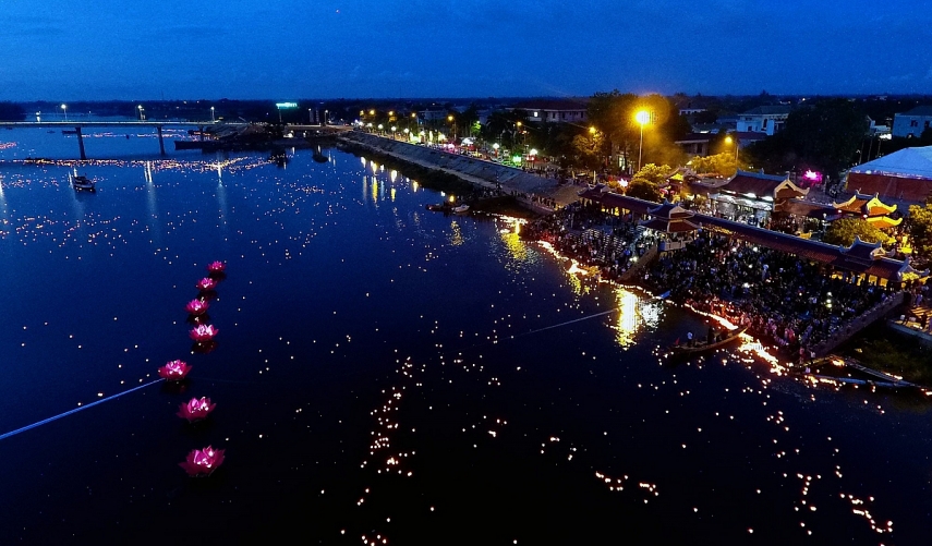 | Hàng vạn đèn hoa đăng thắp sáng dòng sông Thạch Hãn. |