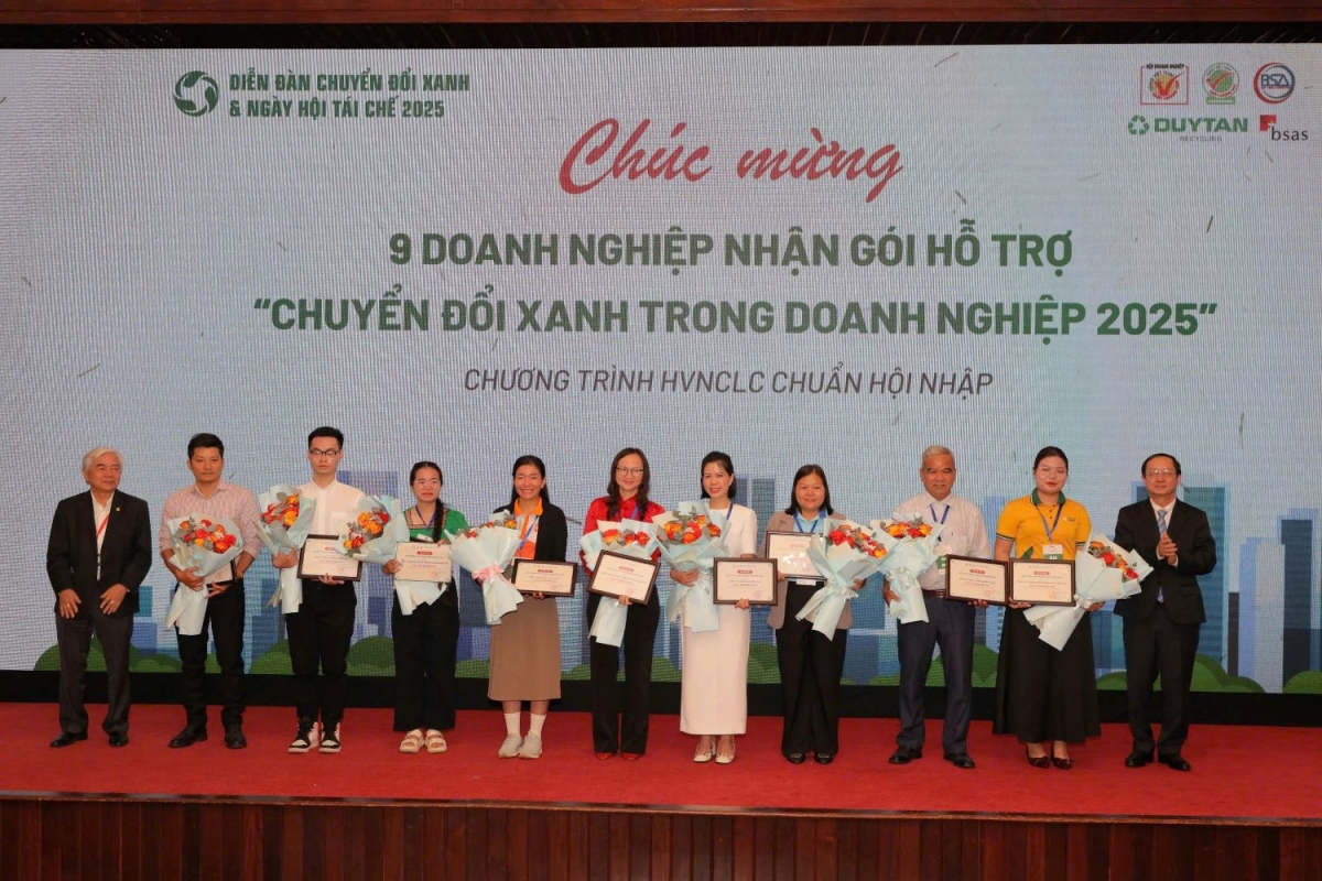 Tại Diễn đàn, Ban Tổ chức cũng công bố và trao “Gói hỗ trợ chuyển đổi xanh trong doanh nghiệp 2025” trị giá hơn 1 tỷ đồng, cho 9 doanh nghiệp do Duy Tân Recycling tài trợ, giúp DN nâng cao quản lý chất lượng, giảm phát thải, hướng đến xuất khẩu và kinh tế tuần hoàn.