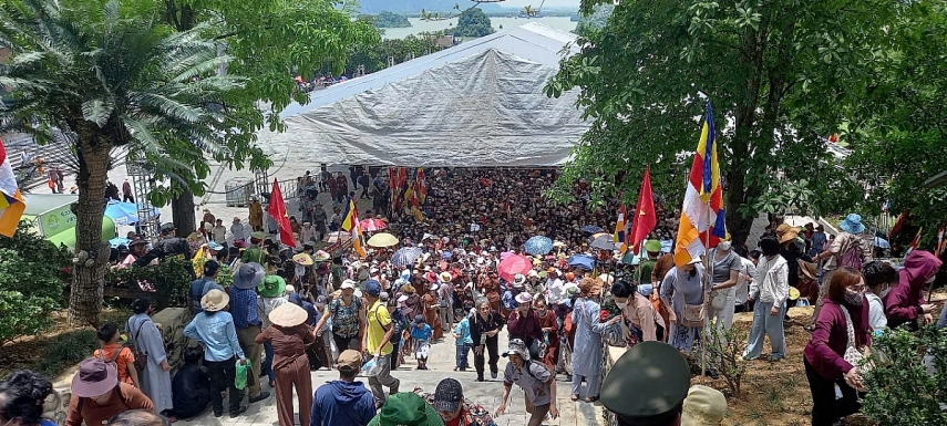 | Hàng vạn người dân, phật tử và du khách đến chùa Tam Chúc để chiêm bái, hành lễ trước xá lợi Đức Phật. |