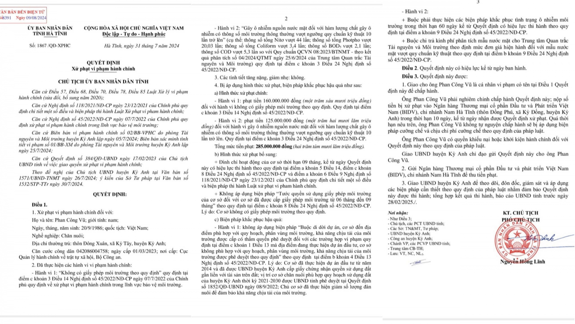Cụ thể, UBND tỉnh Hà Tĩnh xử phạt trang trại lợn này 160 triệu đồng với hành vi không có giấy phép môi trường theo quy định; Phạt 125 triệu đồng với hành vi gây ô nhiễm nguồn nước mặt đối với hàm lượng chất gây ô nhiễm có thông số môi trường thông thường vượt ngưỡng quy chuẩn kỹ thuật 10 lần trở lên, tổng mức phạt các vi phạm là 285 triệu đồng. Ngoài bị phạt tiền, trang trại lợn của ông Phan Công Vũ còn bị đình chỉ hoạt động 9 tháng, buộc thực hiện các biện pháp khắc phục tình trạng ô nhiễm môi trường trong 60 ngày và buộc chi trả kinh phí phân tích mẫu nước mặt cho ngành chức năng theo quy định.