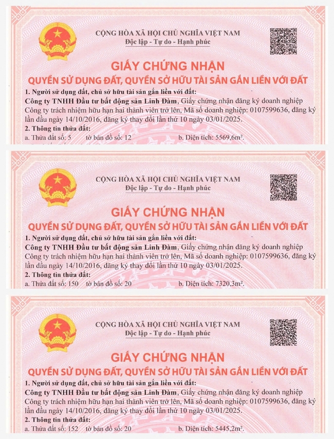 Cụ thể trên ô đất PT1 khu đô thị mới Tây Nam hồ Linh Đàm (quận Hoàng Mai): thửa đất số 150 tại địa chỉ NO4 được cấp Giấy chứng nhận số CT193; thửa đất số 152 tại địa chỉ NO3 được cấp Giấy chứng nhận số CT195; thửa đất số 5 tại địa chỉ NO2 được cấp Giấy chứng nhận số CT196. Việc hoàn tất thủ tục pháp lý và nhận sổ đỏ cho toàn dự án không chỉ khẳng định tính minh bạch, mà còn giúp cư dân yên tâm sinh sống và thực hiện các thủ tục như giao dịch, chuyển nhượng hay thế chấp tài sản trong tương lai.
