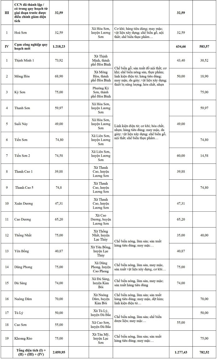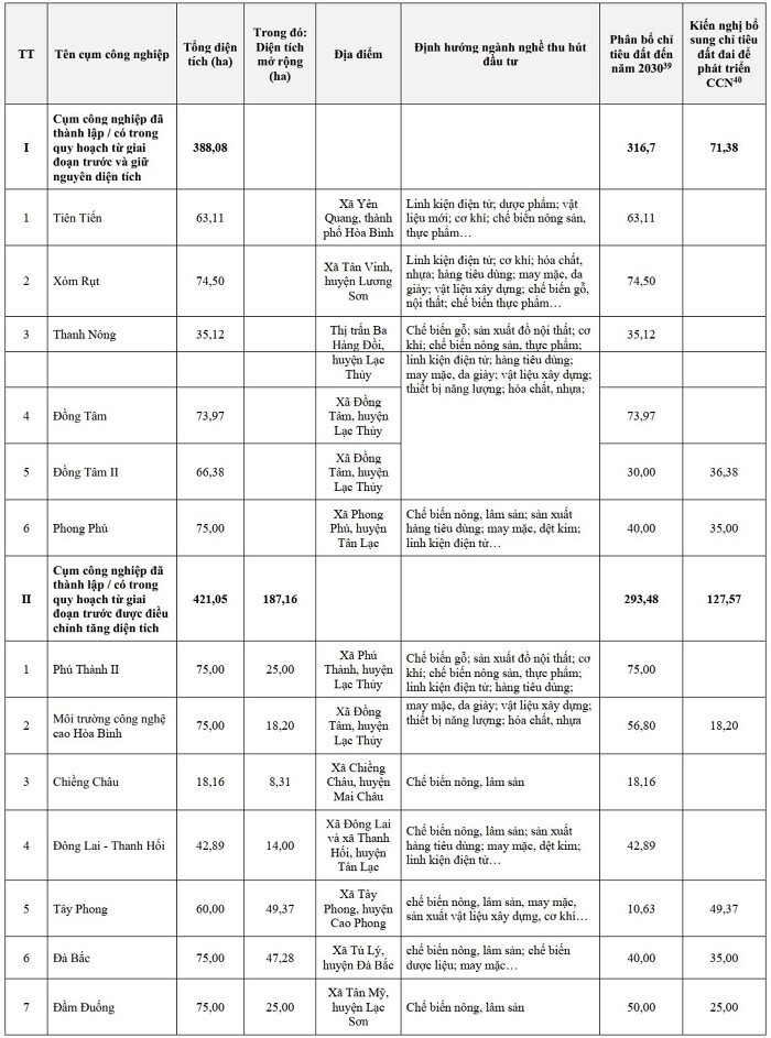 Đồng thời, mở rộng diện tích quy hoạch 7 cụm công nghiệp đã có trong quy hoạch từ giai đoạn trước, gồm: Phú Thành II, Môi trường công nghệ cao Hòa Bình (huyện Lạc Thủy), Tây Phong (huyện Cao Phong), Đông Lai - Thanh Hối (huyện Tân Lạc), Đầm Đuống (huyện Lạc Sơn), Đà Bắc (huyện Đà Bắc), Chiềng Châu (huyện Mai Châu); và điều chỉnh giảm diện tích quy hoạch đối với Hòa Sơn (huyện Lương Sơn);