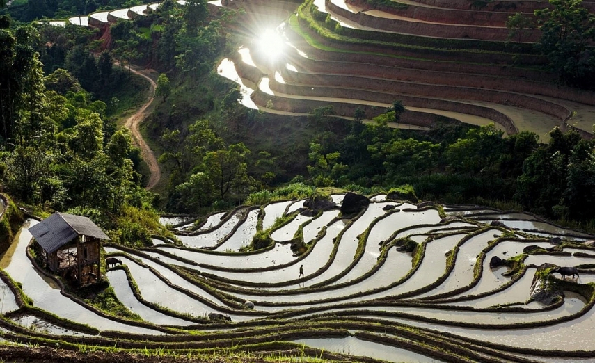 | Mặt trời phản chiếu trên thửa ruộng bậc thang Hoàng Su Phì |