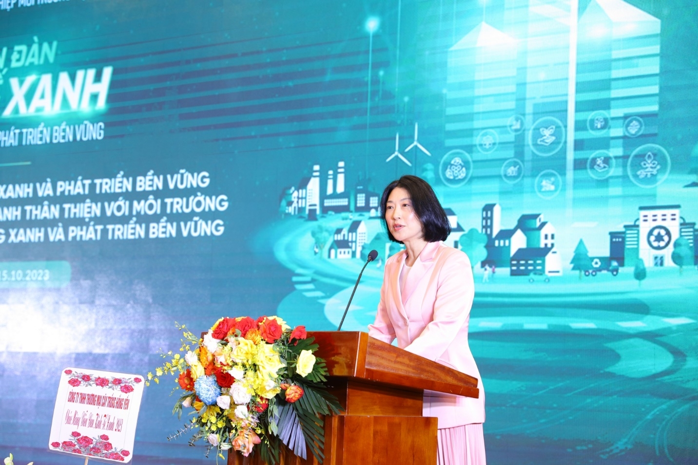 | Bà Wee Sung San Michele - Tổng Giám đốc Ngân hàng TNHH MTV Standard Chartered ( Việt Nam) trình bày tham luận về những thành tựu và mục tiêu phát triển kinh tế xanh và phát triển bền vững |