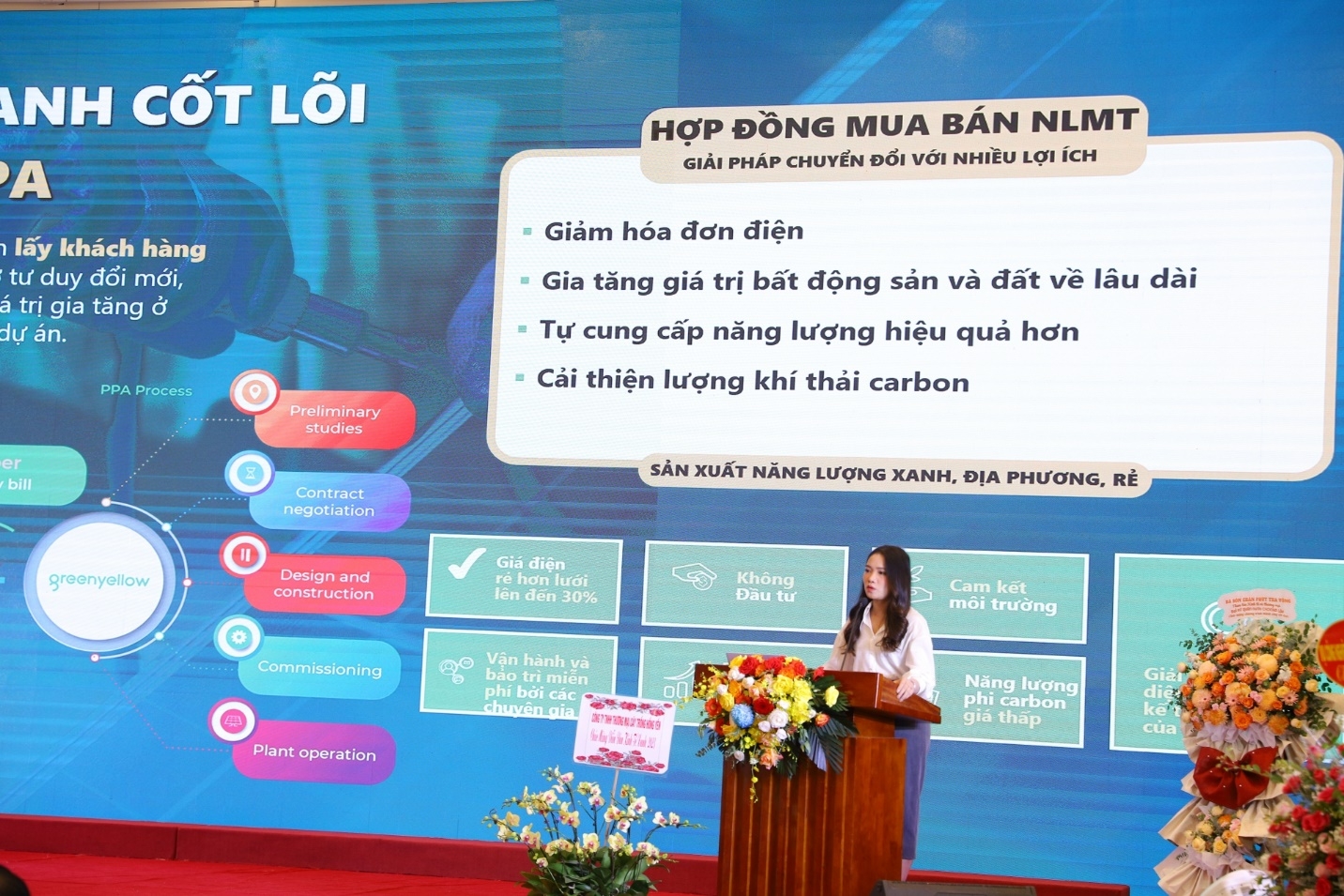 | Bà Vũ Kim Thanh - Giám đốc Phát triển thị trường và Đối ngoại của Công ty TNHH GreenYellow Việt Nam tại Miền Bắc phát biểu tham luận giới thiệu về đầu tư điện mặt trời áp mái, tiết kiệm năng lượng, giải pháp lưu trữ, IREC |