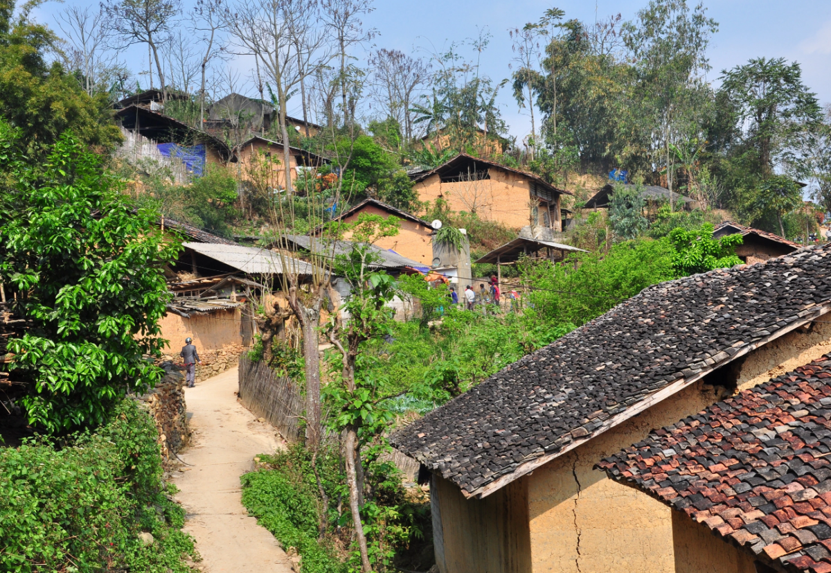 | Những ngôi nhà lợp mái bằng lá cọ ở Xà Phìn giúp cho mùa hè mát mẻ, mùa đông ấm áp |