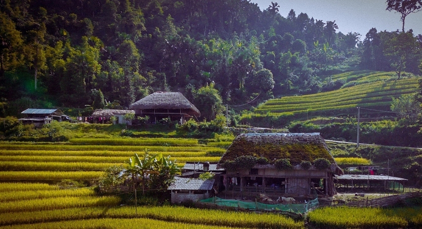 | Một góc ở Du Già tựa lưng vào núi Ba Tiên, trước mặt là cánh đồng lúa chín |