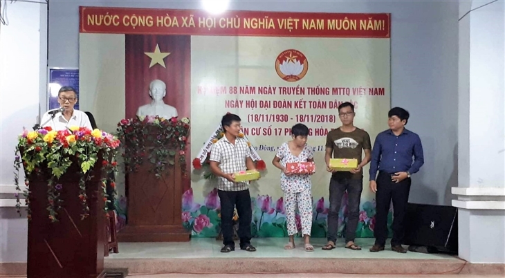 Đồng chí Chủ tịch UBND phường trao quà cho các hộ nghèo, hộ có hoàn cảnh khó khăn