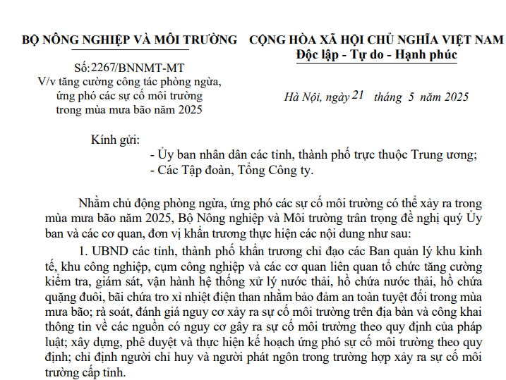 Bộ Nông nghiệp và Môi trường yêu cầu UBND các tỉnh, thành phố khẩn trương chỉ đạo các Ban quản lý khu kinh tế, khu công nghiệp, cụm công nghiệp và các cơ quan liên quan tổ chức tăng cường kiểm tra, giám sát, vận hành hệ thống xử lý nước thải, hồ chứa nước thải, hồ chứa quặng đuôi, bãi chứa tro xỉ nhiệt điện than nhằm bảo đảm an toàn tuyệt đối trong mùa mưa bão; rà soát, đánh giá nguy cơ xảy ra sự cố môi trường trên địa bàn và công khai thông tin về các nguồn có nguy cơ gây ra sự cố môi trường theo quy định của pháp luật; xây dựng, phê duyệt và thực hiện kế hoạch ứng phó sự cố môi trường theo quy định; chỉ định người chỉ huy và người phát ngôn trong trường hợp xảy ra sự cố môi trường cấp tỉnh.