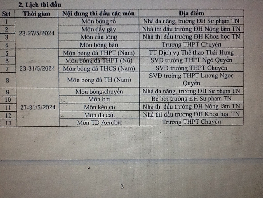 Các môn thi đấu sẽ diễn ra tại sân vận động, nhà đa năng, bể bơi của các trường thuộc Đại học Thái Nguyên, gồm: Đại học Nông Lâm, Đại học Sư phạm, Đại học Khoa học; và được tổ chức tại sân bóng, nhà đa năng của các trường: THPT Ngô Quyền, THPT Chuyên, THPT Lương Ngọc Quyến...