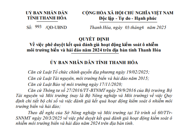 Quyết định: "Về việc phê duyệt kết quả đánh giá hoạt động kiểm soát ô nhiễm môi trường biển và hải đảo năm 2024 trên địa bàn tỉnh Thanh Hóa". |