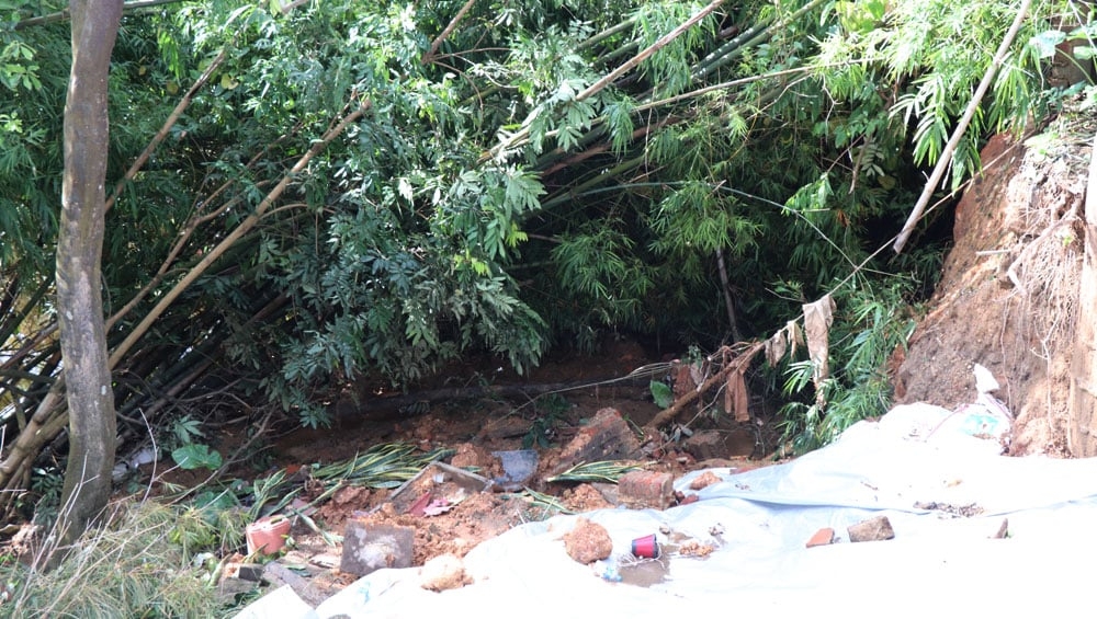| Vị trí sạt lở đã ăn sâu vào sân của hộ ông Ngô Xuân Trường. |